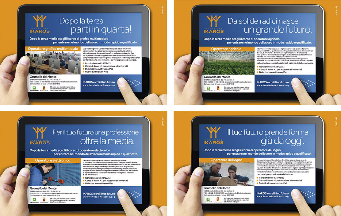 Save as ha realizzato per Fondazione Ikaros la campagna stampa multisoggetto dedicata ai diversi corsi di specializzazione, presente in questi giorni sul Corriere della Sera e l’Eco di Bergamo.