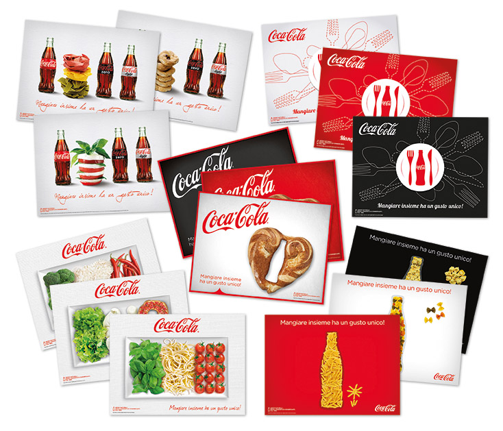 Save as ha ideato per Coca-Cola HBC Italia 5 differenti set di tovagliette americane in 3 soggetti ciascuno che esaltano l’abbinamento con il food e l’italianità, rendendo la tavola colorata e appetitosa.