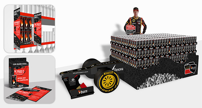 Promozioni dedicate ai punti vendita Carrefour e Autogrill comunicate attraverso materiali POP scenografici permetteranno ai consumatori di burn di partecipare a semplici concorsi che mettono in palio premi imperdibili: vip pass per il GP di Monza, fantastiche polo ed esclusive Lotus Team Jacket.