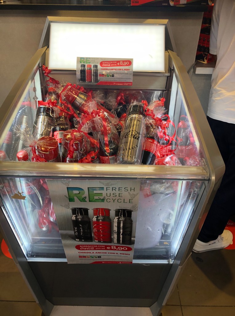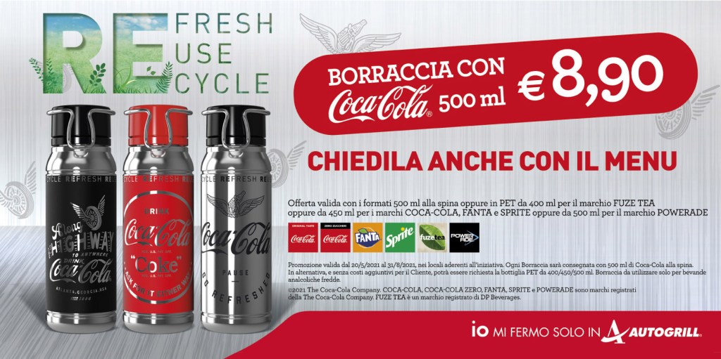 Per il terzo anno la borraccia Coca-Cola è eco-sostenibile e disponibile nel periodo estivo in tutti i punti vendita delle insegne del gruppo Autogrill (Autogrill, Ciao, Spizzico, Burger King).