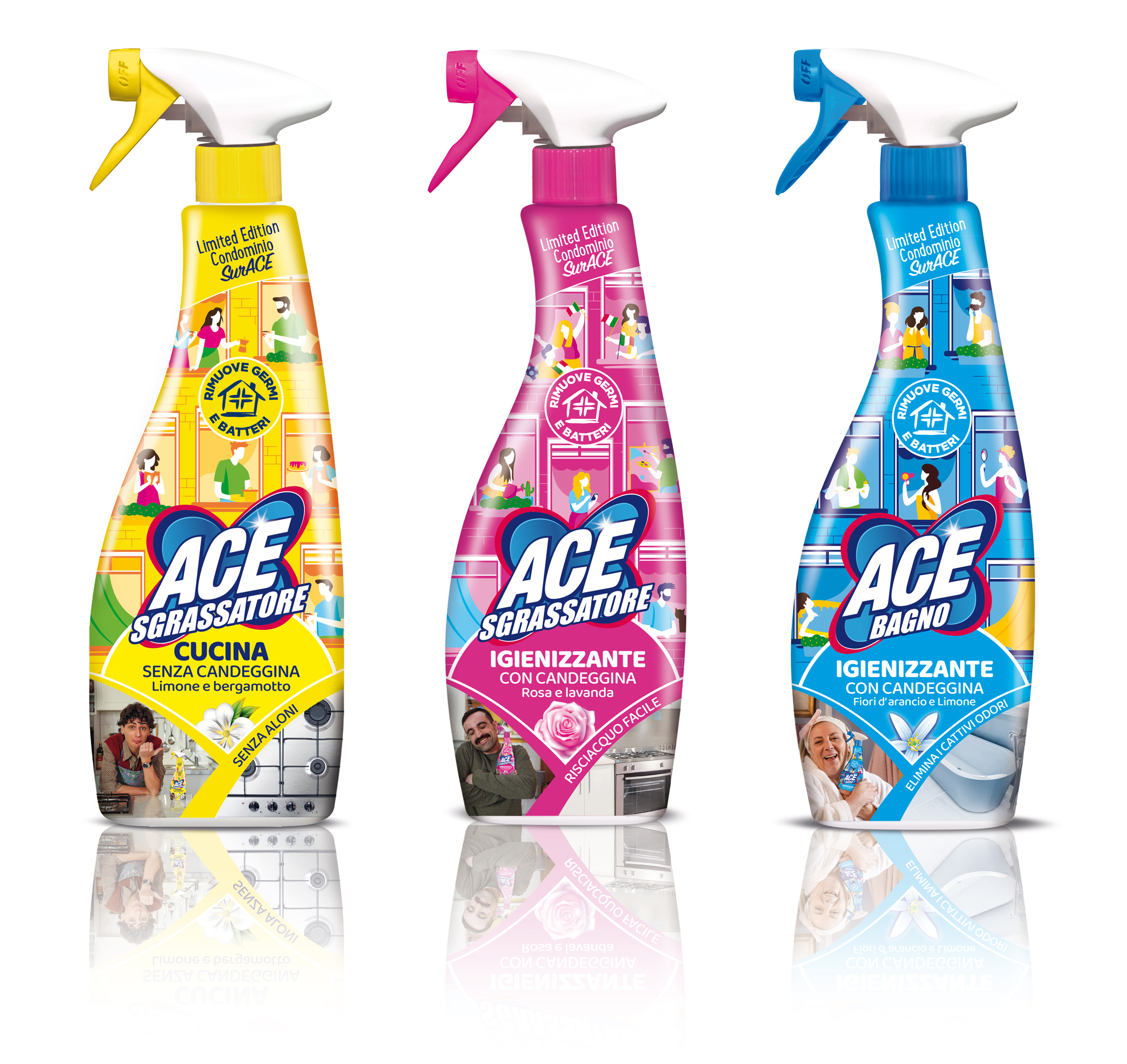 Ispirandosi ad un forte insight, che conferma come durante il lockdown gli italiani abbiano riscoperto la propria casa e rivalutato il rapporto interpersonale con i vicini, la limited edition raffigura scene ‘alla finestra’ di un tipico condominio, differenziate in base agli ambienti e agli utilizzi dei diversi prodotti della linea (cucina, bagno, universale). E’ inoltre caratterizzata da colori molto vivaci ed accesi che intendono restituire l’ allegria e la positività di un pieno ritorno alla normalità, oltrechè massimizzare la visibilità nel punto vendita. Infine dà spazio ai personaggi di Casa Surace, già testimonial molto seguiti ed apprezzati di Ace Casa, che ne suggellano i plus di prodotto.