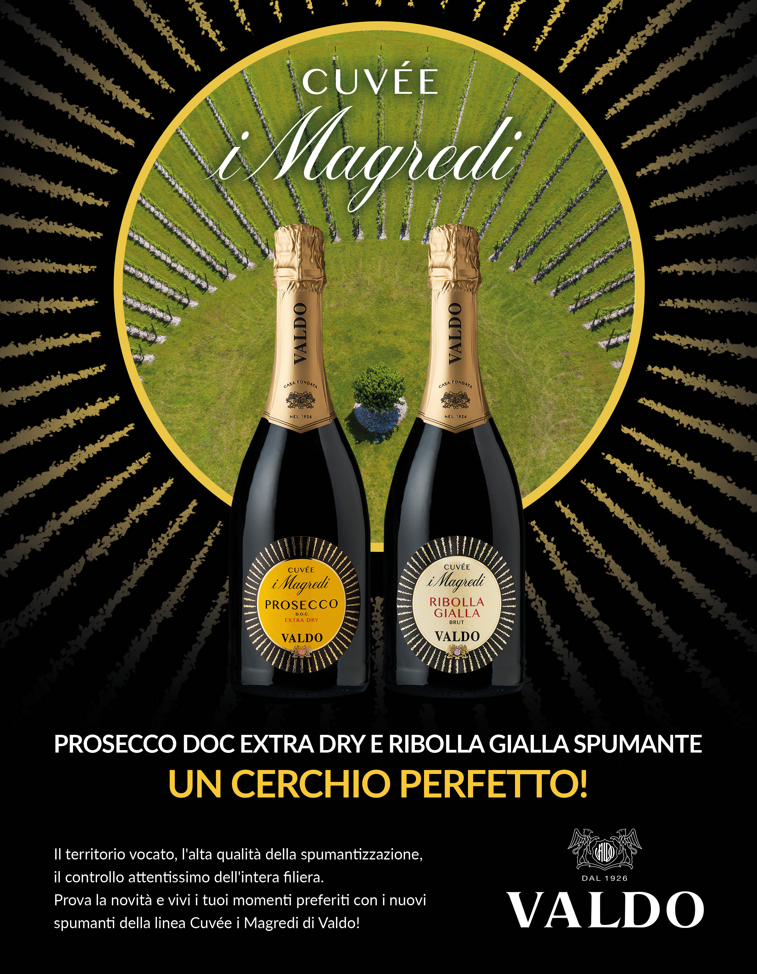 Un cerchio perfetto è il concept ideato e sviluppato dall’agenzia per la campagna di lancio in-store e out-of-store della Linea Cuvèe Magredi di Valdo, per tutti punti vendita della rete Agorà (Basko, Tigros, Iperal, Poli/Orvea, Rossetto). Un cerchio perfetto come è perfetta la filiera, che si apre con il controllo della coltivazione delle uve e si chiude con la spumantizzazione. Un cerchio perfetto come lo è l’esperienza di consumo, il perlage dello spumante, il momento del brindisi che sancisce momenti perfetti. I 3 pillar che determinano la top quality dello spumante friulano, che nasce da i Magredi ed è firmato da Valdo, sono annunciati della body copy, che si chiude con l’invito a provarlo. Il visual mette in evidenza le due bottiglie circondate dal cerchio perfetto, forma caratteristica dei vigneti de i Magredi, che diventa così elemento iconico e fortemente distintivo dell’azienda.