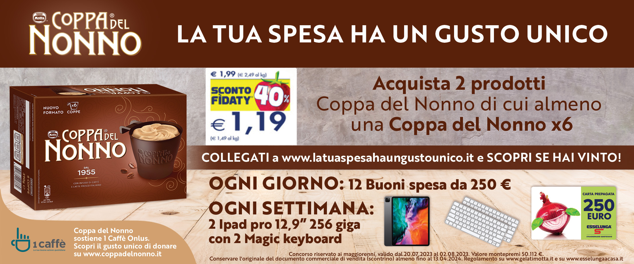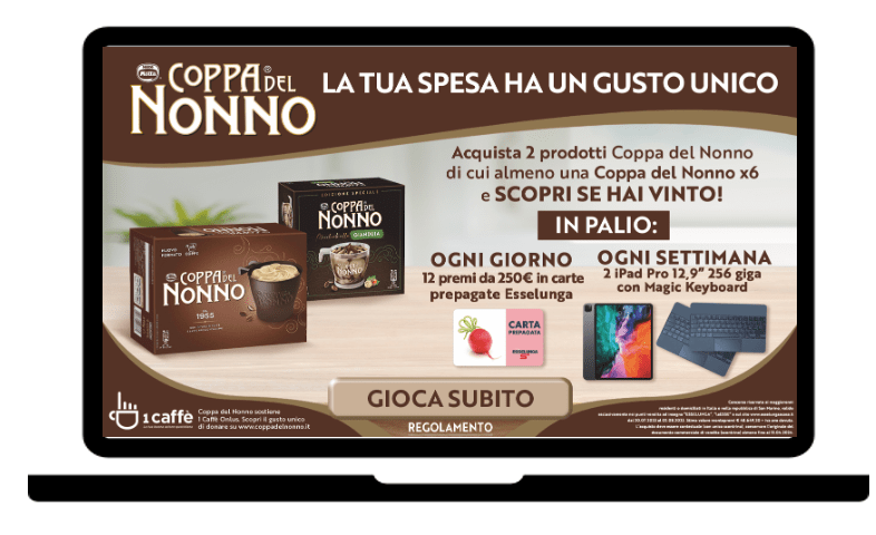 In occasione del restyling della storica coppa e del sostegno all’ iniziativa onlus ‘1 Caffè’, Coppa del Nonno dedica ai clienti di Esselunga una shopper activation con ricchi premi giornalieri e settimanali, avvalendosi di Save As per la comunicazione e gli aspetti legali.