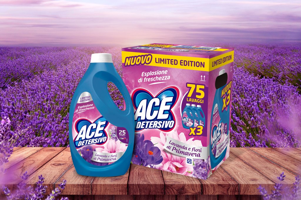 Arriva nei punti vendita italiani la Limited Edition di Primavera di ACE Detersivo che, oltre ai benefit classici della detergenza (pulizia, rimozione delle macchie, rimozione di germi e batteri, efficacia anche a freddo) è caratterizzata da un profumo primaverile che dura a lungo. Una profumazione differente ed esclusiva rispetto alle varianti di detersivo ACE presenti sul mercato, composta da 5 note olfattive tra le quali quelle più intense sono lavanda e bouquet floreali. La fragranza primaverile offre un equilibrio tra freschezza e sensualità; le note distintive di lavanda conferiscono un carattere rilassante e pulito ed un profilo olfattivo equilibrato e sofisticato. Pack e pop materials sono firmati da Save As.