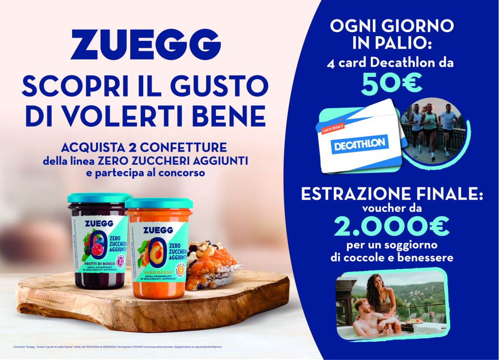 Continua il trend favorevole dei prodotti free from di Zuegg a ridotto contenuto calorico. Il concorso presente in questi giorni nei migliori punti vendita italiani e diffuso sui diversi touchpoint del customer journey, è ideato e gestito da Save As (creatività, ricerca ed acquisto premi, produzione pop materials, acquisto premi, gestione concorso, analisi redemption) e vede protagoniste le confetture Zero zuccheri aggiunti con il 60% di frutta e poche calorie per porzione. Gusto naturale senza compromessi.