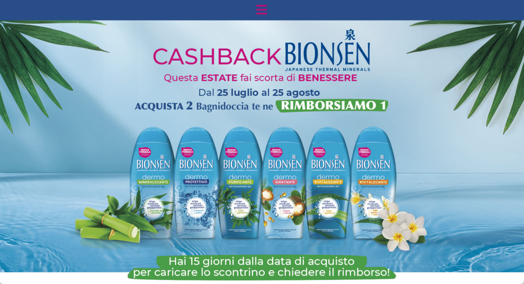Anche Bionsen sceglie di stare dalla parte dei consumatori, adottando “FRIENDLY CASHBACK”, proposto da Save As che ne ha curato la comunicazione. Una tipologia di cashback innovativo che non prevede clausole troppo stringenti sui tempi di richiesta dei rimborsi (dal 5° al 15° giorno avviene un +10% di acquisti da ‘veri’ clienti, non concorsisti), converte le procedure complesse per richiedere informazioni in richieste di informazioni utili a profilare shopper/consumer, richiede scontrini in originale solo a palesi scontrini falsificati, il Customer Care è effettivamente Care.